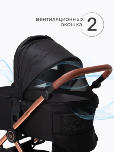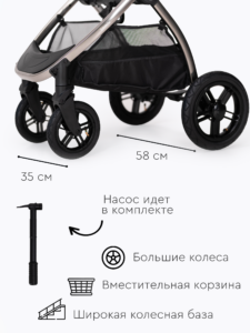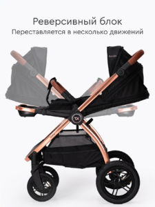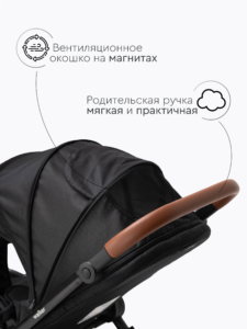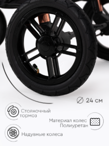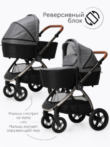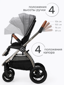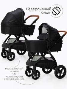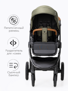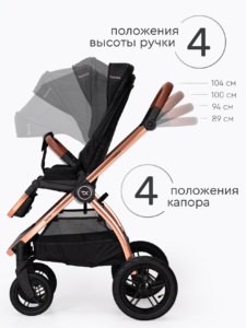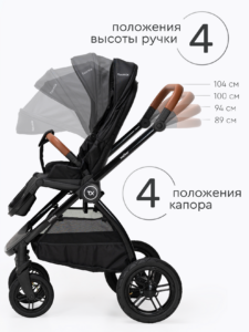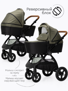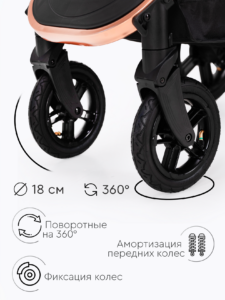 Прогулочный блок коляски оснащен регулируемой в 3 положениях спинкой для оптимального комфорта ребенка, а большой капюшон обеспечивает надежную защиту малыша от солнца и непогоды. Ремни безопасности регулируются по высоте, подстраиваясь под рост ребенка. Бампер отсоединяется с любой стороны для удобной посадки. Капюшон оснащен удобным смотровым окном для дополнительного общения с ребенком. Колеса надувные (насос в комплекте) из PU материала, передние колёса имеют диаметр 18 см и амортизацию с возможностью фиксации, а задние — 24 см. Передние поворотные колеса оснащены амортизацией для плавного движения, а также имеют возможность фиксации.