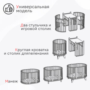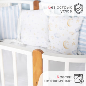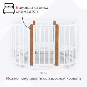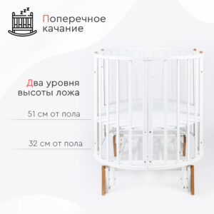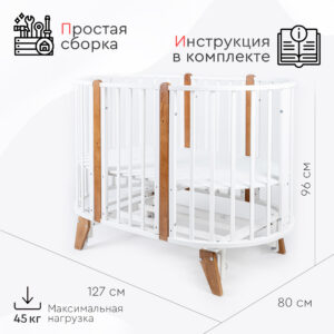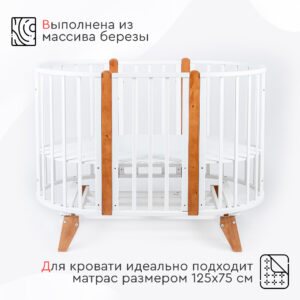 Маятник в комплекте! Экологичная овальная кроватка-трансформер Tomix Bella выполнена из отборной древесины березы и прочного МДФ. Детская кровать покрыта нетоксичными гипоаллергенными лаками и красками на водной основе. Благодаря вставкам из бука и необычным ножкам, кровать смотрится стильно и современно. Кровать растет вместе с ребенком и имеет несколько вариантов трансформации: - круглая кроватка (75*75 см) и пеленальный столик; - овальная кровать (125*75 см), которую можно использовать как приставную ко взрослой кровати, сняв боковую стенку; - диванчик; - манеж; - столик для кормления и игры и 2 стульчика; Кровать Bella оснащена маятником поперечного качания, который может быть установлен как на круглую кроватку, так и на овальную. Ложе кровати регулируется по высоте в 2 положениях (51 и 32 см от пола). Для сна малыша используется верхнее ложе. Нижний уровень можно использовать, когда ребенок подрастет, и кроватка может использоваться как манеж. Кровать оснащена 4 колёсами с возможностью фиксации и установки в различных положениях (для круглой и овальной кроватки). Также можно установить кровать на ножки, что добавит ей легкости и изящности. Габариты и вес: Размеры круглой кроватки, (Д*Ш*В) см: 77х80х96 (высота с учетом ножек) Размеры овальной кровати, (Д*Ш*В) см: 127х80х96 (высота с учетом ножек) Размер спального места круглой кроватки, см: 75х75 Размер спального места овальной кровати, см: 125х75 Вес кровати, кг: 26 Вес с упаковкой, кг: 27,2