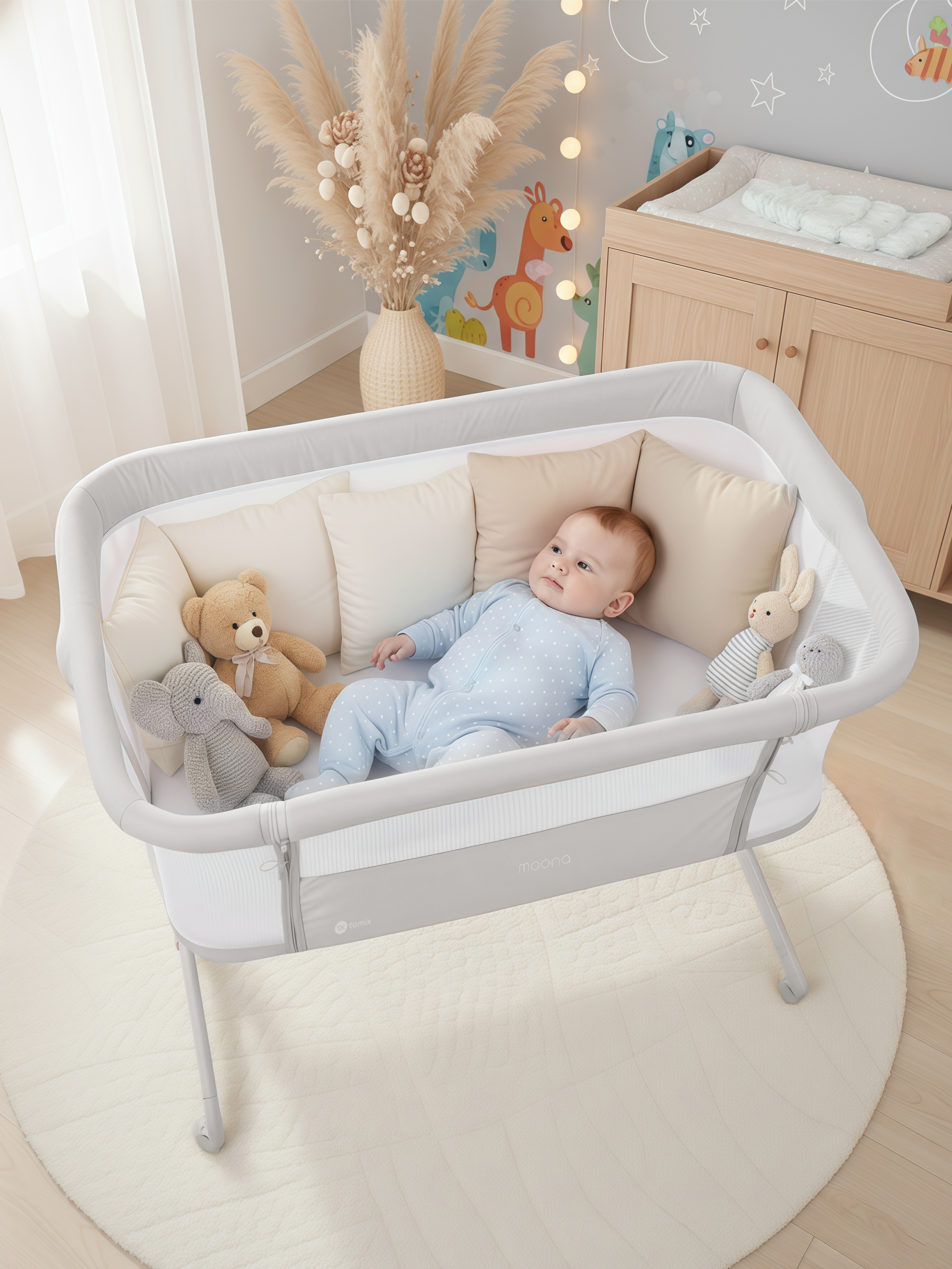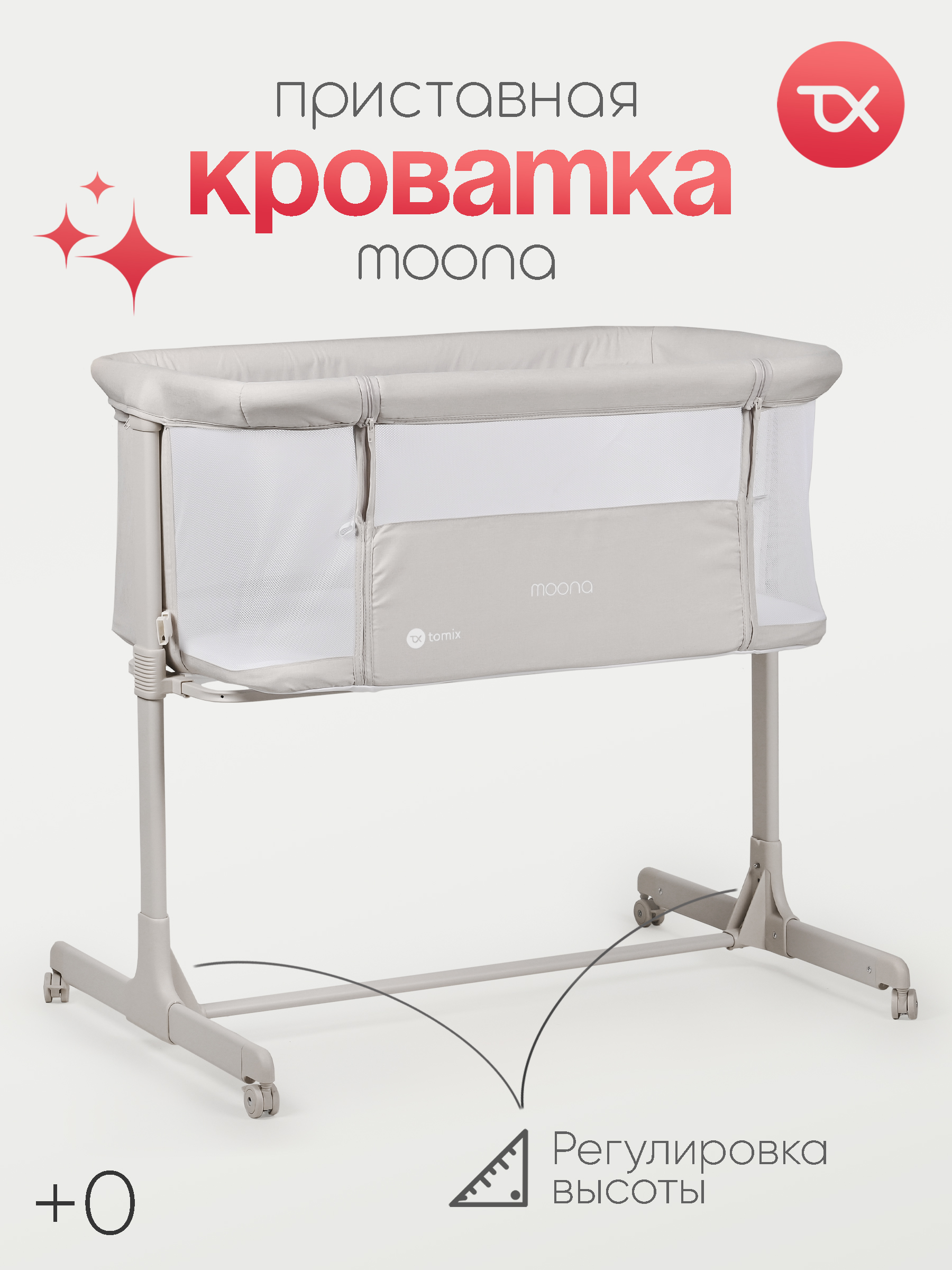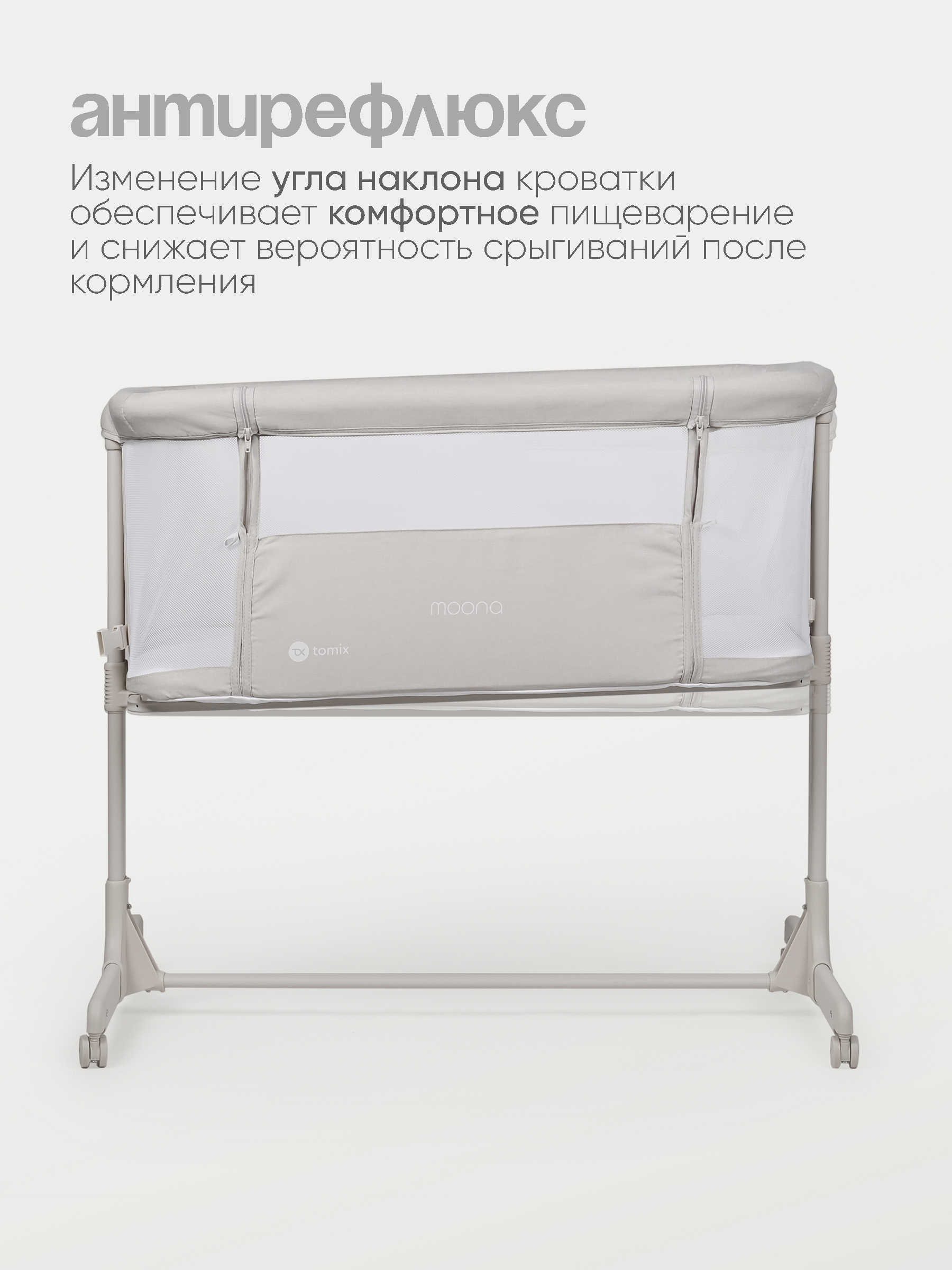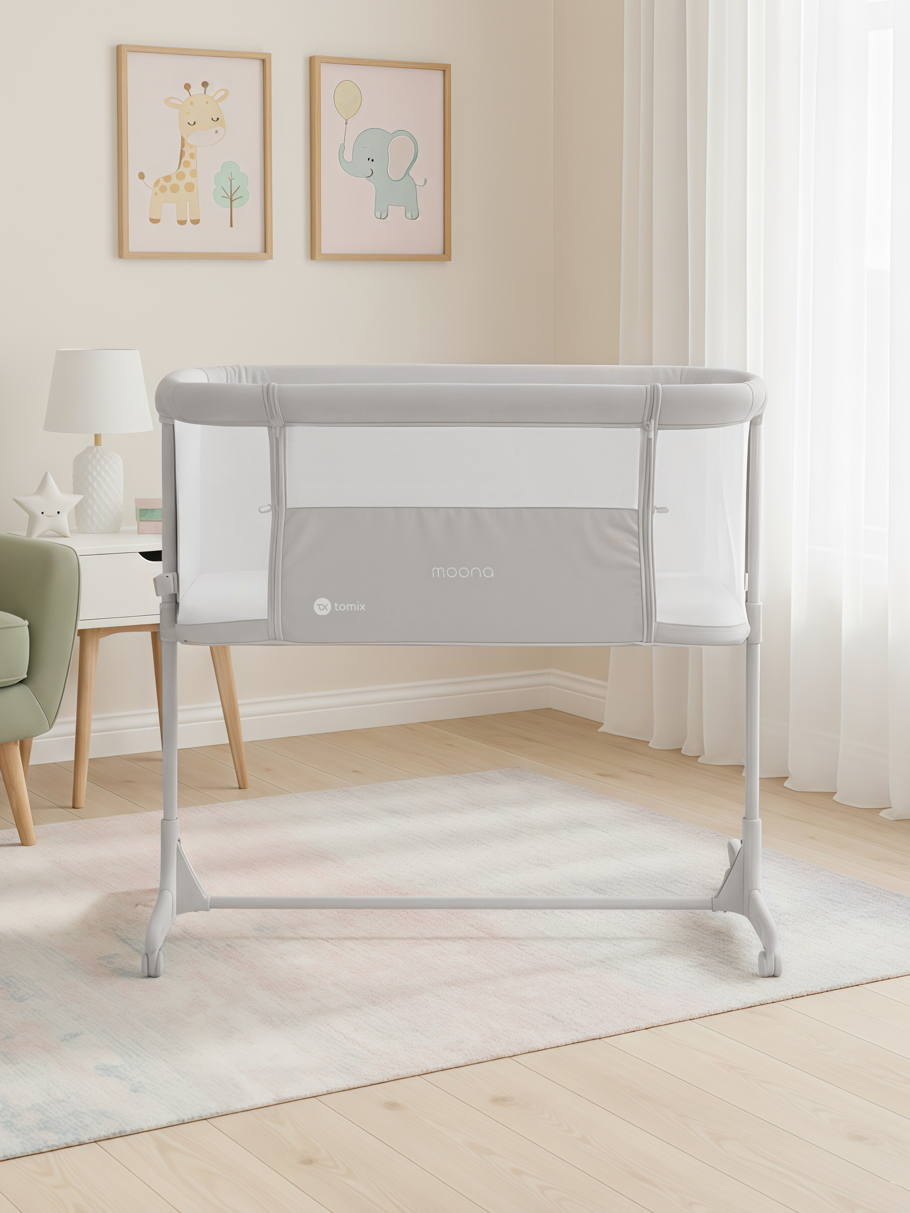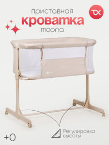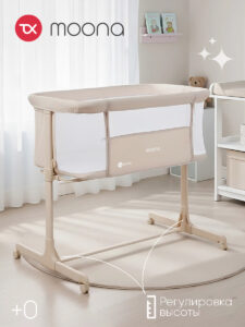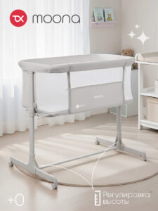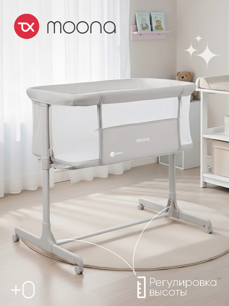 Приставная кроватка для новорожденного ребенка Tomix Moona. Может использоваться как отдельно стоящая кроватка с удобным перемещением по квартире или как приставная кроватка для ночного сна рядом с мамой.