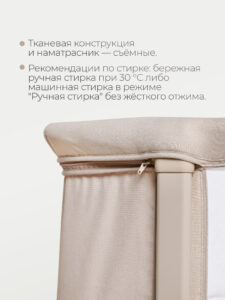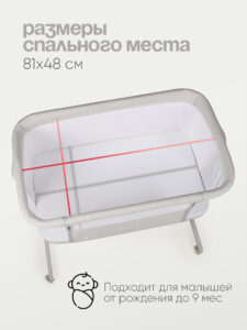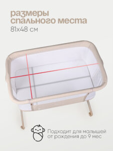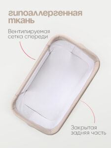 Кроватка имеет жесткое основание и удобную регулировку спального ложа по высоте. Одна сторона кроватки выполнена из сетчатого материала для улучшения циркуляция внутри кроватки и хорошего обзора для родителей. Обивка кроватки выполнена из качественного гипоаллергенного материала.