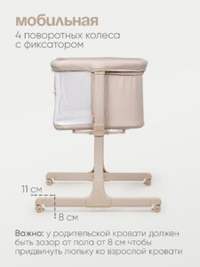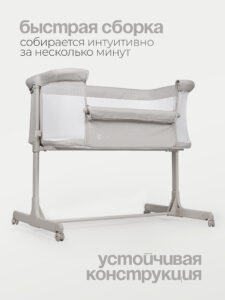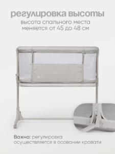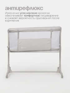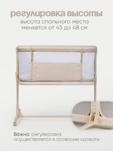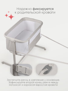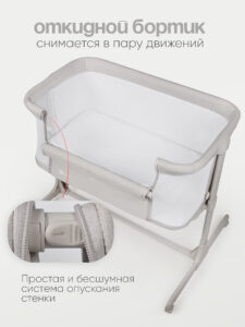 Одна сторона кроватки опускается, позволяя во время ночного сна фиксировать кроватку рядом со взрослой кроватью. Специальные крепежные ремни позволят надежно зафиксировать кровать рядом с родителями. Сон вместе с мамой позволит малышу чувствовать себя более защищенным и значительно облегчит кормление в ночные часы.