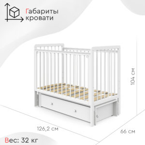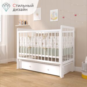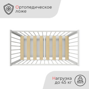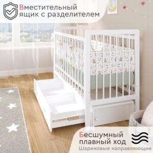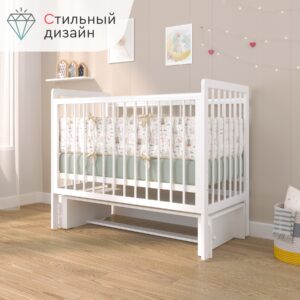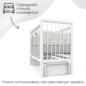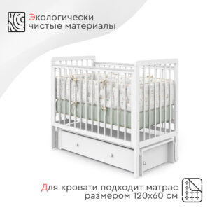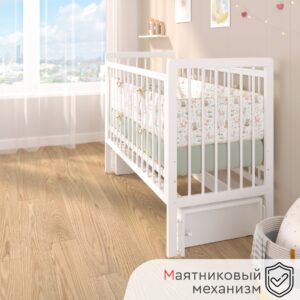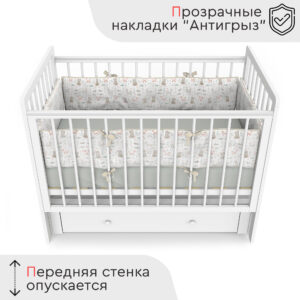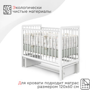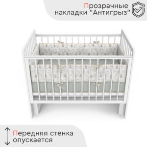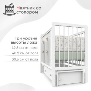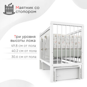 Пластиковые прозрачные накладки «Антигрыз» защищают ограждения кроватки. Маятниковая конструкция позволяет использовать модель в качестве люльки, а механизм-стопор фиксирует кроватку.