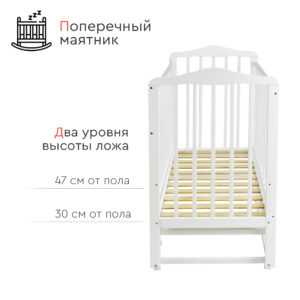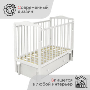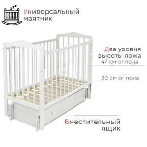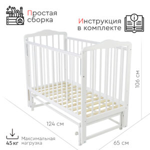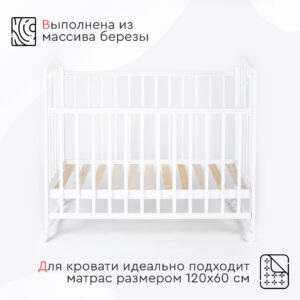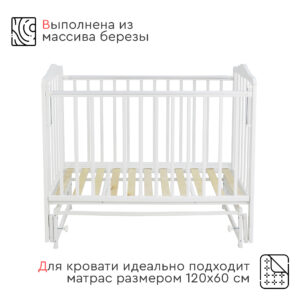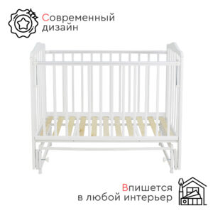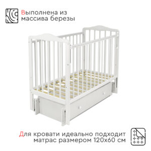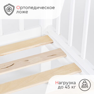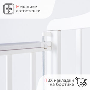 Кровать оснащена механизмом опускания передней стенки (автостенка), что облегчает уход за младенцем. Для защиты детских зубов предусмотрены ПВХ накладки на бортики.