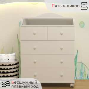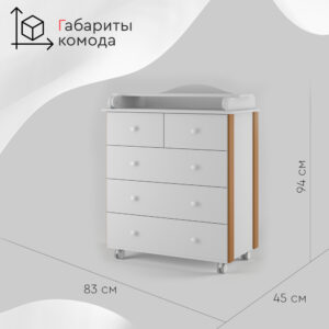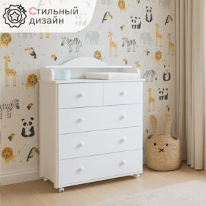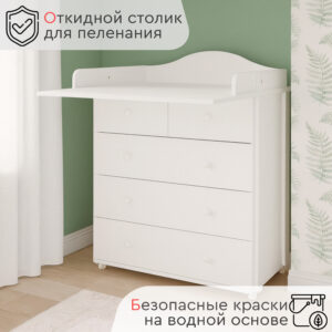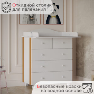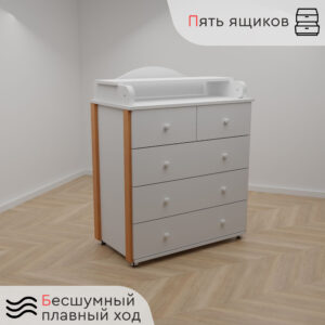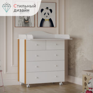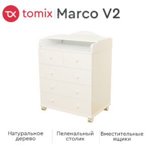Стильный современный пеленальный комод Tomix Marco V2 станет изюминкой в интерьере детской комнаты. Белый цвет гармонично сочетается со вставками из натурального дерева. Комод имеет 5 ящиков: 3 больших ящика для хранения детских вещей и постельного белья и 2 маленьких – для средств гигиены и прочих детских принадлежностей. Ящики устанавливаются на телескопические роликовые направляющие, что обеспечивает плавность хода и долгий срок службы. Сверху комода устанавливается откидная пеленальная доска, которую в дальнейшем можно убрать. Комод оснащен роликовыми колесами для удобства перемещения. Детский комод изготовлен из ЛДСП, декорирован планками из натуральной древесины.
