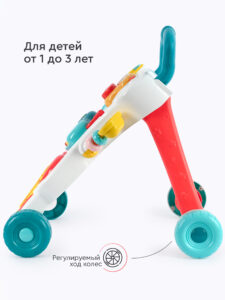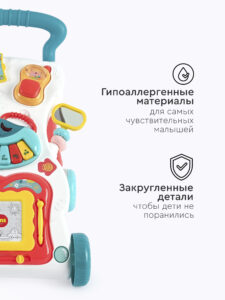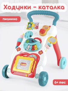 Ходунки-каталка – это инновационная развивающая игрушка, которая поможет вашему малышу учиться ходить и одновременно развлекаться. Эти ходунки имеют четыре надежных колеса с возможностью фиксации, позволяющих ребенку легко и безопасно передвигаться. Одна из главных особенностей этих ходунков – это удобная ручка, за которую ребенок может держаться, чтобы сохранять равновесие при ходьбе. Благодаря этой ручке малыш будет чувствовать себя увереннее и быстрее освоит навык ходьбы. Ходунки-каталка оснащены множеством забавных и обучающих игрушек: телефон, книжечка, различные шарики и безопасное зеркальце, в которое малыш может себя рассматривать. Снимаемые игрушки позволят ребенку изучать формы и цвета, развивать мелкую моторику и фантазию. Один из самых увлекательных элементов игрушки – это музыкальный модуль-пианино. Он оснащен разноцветными клавишами и издает приятные звуки при нажатии. Играя с этим модулем, малыш сможет развивать слух и чувство ритма. В ходунки также встроен съемный магнитный планшет для рисования – идеальное решение для маленьких художников. Ребенок сможет рисовать на планшете специальными магнитными ручками, а затем с легкостью стирать свои шедевры. Для работы музыкального модуля понадобится 2 батарейки типа АА (в комплект не входят).