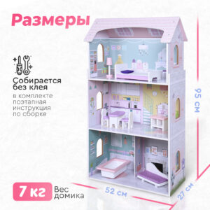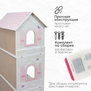 Дом имеет прочную деревянную конструкцию, благодаря чему прослужит много лет. Собирается с помощью понятной поэтапной инструкции (для сборки понадобится крестовая отвертка).